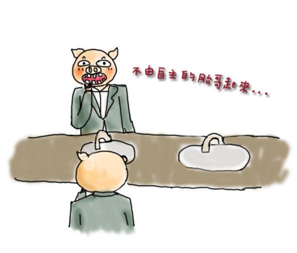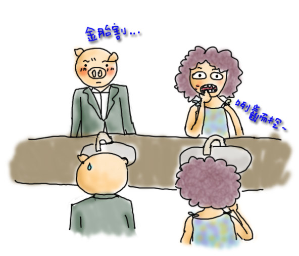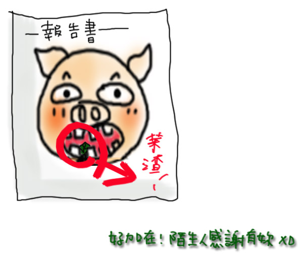 前幾天本豬去家裡附近的某大百貨面試, 出門前,該死的雨後雷陣雨發生了.... 幸好時間還早,還有時間還原儀容; 於是先進入百貨公司營業樓層的廁所, 用衛生紙吸亁絲襪~補個妝,把亂髮稍微整理一下云云~ 正當我在鏡子前盯著穿起套裝渾身不自在的自己時; 旁邊來了一個少婦級人物,原本看起來也正規正舉, 沒想到轉瞬間她咧開嘴巴開始摳自己的齒縫......... 金胎哥..... 幸好她摳完沒幾分鐘就走了.... 不知各位是否有種經驗, 有時雖然覺得某首歌很蠢~某句話很白目, 但四下無人之時,心裡卻不免蠢蠢欲動... 於是,就在她走了之後,整間廁所又趨於空曠之時; 我也咧開我的嘴巴看看自己的齒縫......................... 我知道很蠢,但這真是一種不由自主的魔力呀! 你以為這個故事就到這裡嗎? 咳咳!張開嘴巴之後發現了一個驚人的事情, 足以讓我感謝這個陌生人至少直到職缺結果揭曉... [如果錄取了我一定會一輩子感謝他XD] 嗯,我想,面試官就算再怎麼奇怪, 也不會想要看到大菜渣的。 謝謝你!陌生的摳牙縫少婦!!!!